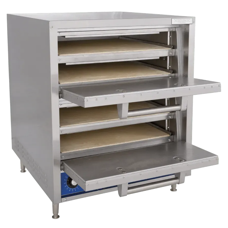 The Bakers Pride® model P44S oven is a great choice for fresh-dough pizza, prebaked crust, pretzels, flatbreads, and other bakery products. Bake directly on the deck or on screens, pans, or baking sheets. This oven has two independently controlled cooking chambers, each featuring two Cordierite decks and 3.25" deck heights. Each chamber also has a 15-minute, electric timer with continuous-ring alarm and manual shut-off. This oven comes standard with a stainless steel exterior and 4” adjustable legs. International voltages are available. Ovens are stackable.